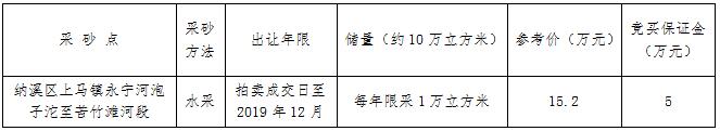 我公司受委托,于2017年4月6日上午10時在納溪區(qū)公共資源交易中心面向社會公開拍賣瀘州市納溪區(qū)上馬鎮(zhèn)永寧河泡子沱至苦竹灘河段采砂點的采砂權。具體事項公告如下: