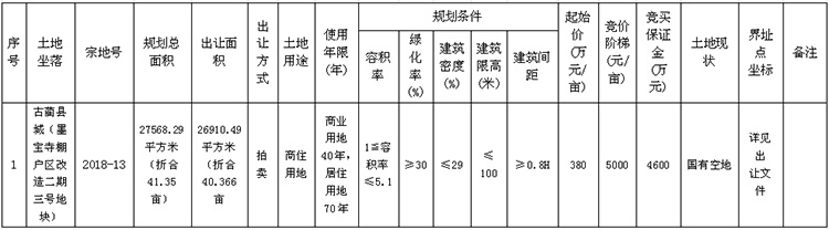 自《公告》發(fā)布之日起,有意競買者可于2018年10月15日17:00時(shí)前到古藺縣公共資源交易中心咨詢、索取出讓文件。競買申請人須于2018年10月15日下午17:00時(shí)前(節(jié)假日除外)申請人憑競買保證金繳納憑證(競買保證金須存入古藺縣公共資源交易中心指定賬戶,并經(jīng)核準(zhǔn)到賬)及出讓文件規(guī)定須提交的相關(guān)資料到古藺縣公共資源交易中心辦理申請競買手續(xù)。經(jīng)審查,申請人按規(guī)定交納競買保證金且具備申請條件的,憑競買資格確認(rèn)通知書參加拍賣會(huì)。(詳見出讓文件)